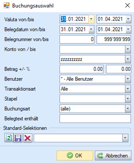 [Standard] | Öffnet einen Dialog zur Auswahl einer Standardbuchung, welche als Buchungsvorlage in die Buchungserfassung übernommen werden sollen. | ||||||||||||||||