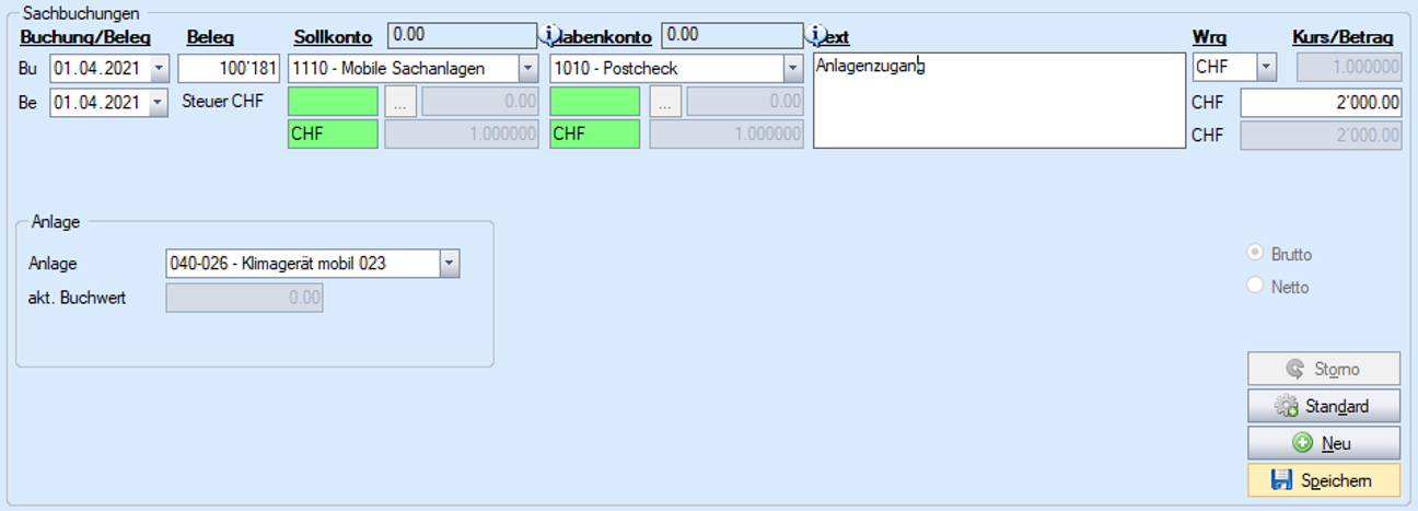 Ist ein bebuchtes Konto als sogenanntes Anlagekonto (=Sammelkonto) deklariert (siehe Stammdaten/Kontoplan der Finanzbuchhaltung), erscheint folgender Dialog mit der Aufforderung die Aktivierung einer Anlage zuzuweisen, wobei natürlich nur Anlagen zur Auswahl stehen, welche auf dieses Anlagesammelkonto zeigen (siehe Stammdaten/Anlagen der Anlagenbuchhaltung). Buchungen mit Anlagekonto auf der Sollseite werden in der Anlagenbuchhaltung als Zugang ausgewiesen und solche mit Anlagekonto auf der Habenseite als Teilabgang ohne Wertberichtigungen bzw. Ausbuchung von kumulierten Abschreibungen. Ein Vollabgang mit Wertberichtigung, Liquidationserlös, Gewinn/Verlustbuchung, etc. wird in der Anlagenbuchhaltung aus dem entsprechenden Anlagenstamm gebucht (siehe Stammdaten/Anlagen/[Abgang]). Planmässige Abschreibungen, Sonderabschreibungen und kalkulatorische Zinsen werden ebenfalls mit den spezifischen Funktionen direkt aus der Anlagenbuchhaltung gebucht.