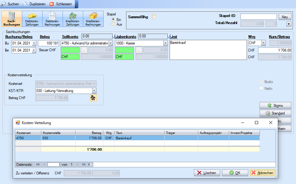 Betrag CHF | Betrag in Basiswährung Hinweis: Da die Betriebsbuchhaltung eine interne Buchhaltung ist, wird bei kostenwirksamen Fremdwährungsbuchungen immer der Betrag in Mandanten-Basiswährung in die Betriebsbuchhaltung verbucht. | ||||||||||||||||