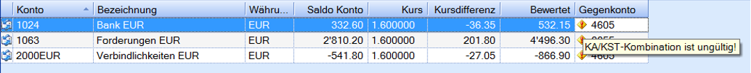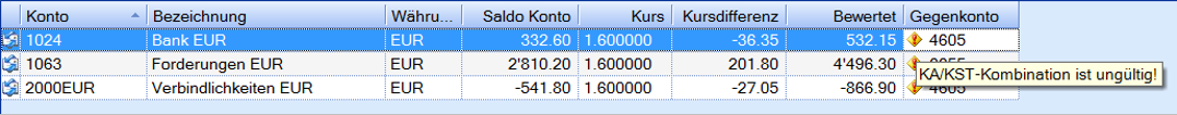 Kurs | Kurs Das Feld Kurs ist nur bei sogenannten Fremdwährungsbuchungen zur Bearbeitung aktiv ( Buchwährung=Fremdwährung). Der Kurs wird aufgrund des Buchungsdatums der Buchung (Feld Bu) aus der Währungstabelle vorgeschlagen und kann bei Bedarf vom Anwender geändert werden. Im Feld Betrag Basiswährung wird anhand des Kurses und dem Umrechnungsfaktor der Währungstabelle der berechnete Basiswährungsbetrag vorgeschlagen. Hinweis: | ||||||||||||||||