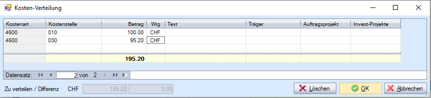 Öffnet ein Fenster für die Verteilung des Buchungsbetrages auf mehrere KST/KTR und/oder auf Projekte der Betriebsbuchhaltung. | |||||||||||||||||