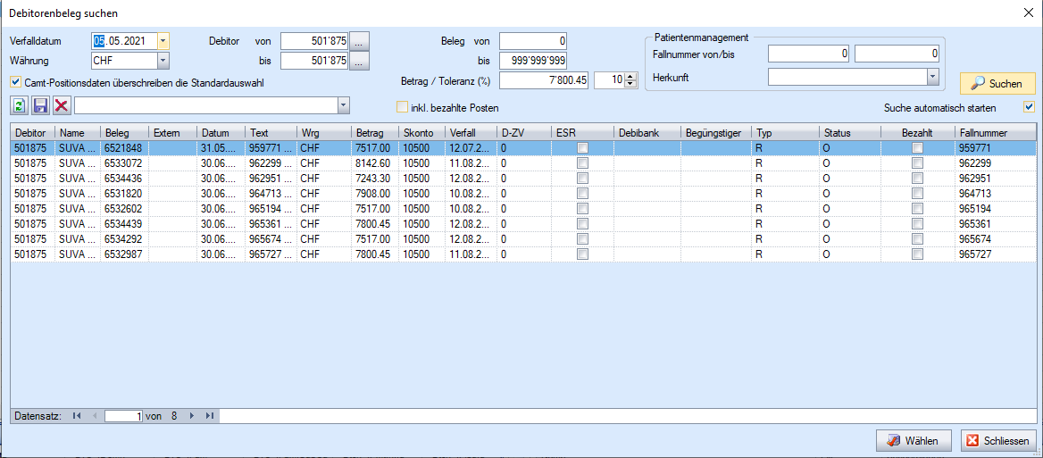 Sollen andere oder weitere Buchungen im Buchungsgrid angezeigt werden, können die gewünschten Selektionskriterien über die Toolbarfunktion [Suchen] bestimmt und das Buchungsgrid damit abgefüllt werden. Das Suchfenster kann auch direkt mit der Funktionstaste F12 aufgerufen werden. Im Buchungsgrid sind daraufhin die Buchungen gemäss Suchkriterien des Suchfensters zur Bearbeitung verfügbar. Einzelne Buchungen können mittels Doppelklick aus dem Grid in die Bearbeitungsmaske geladen werden.
