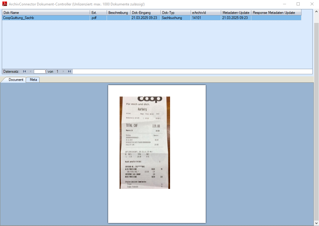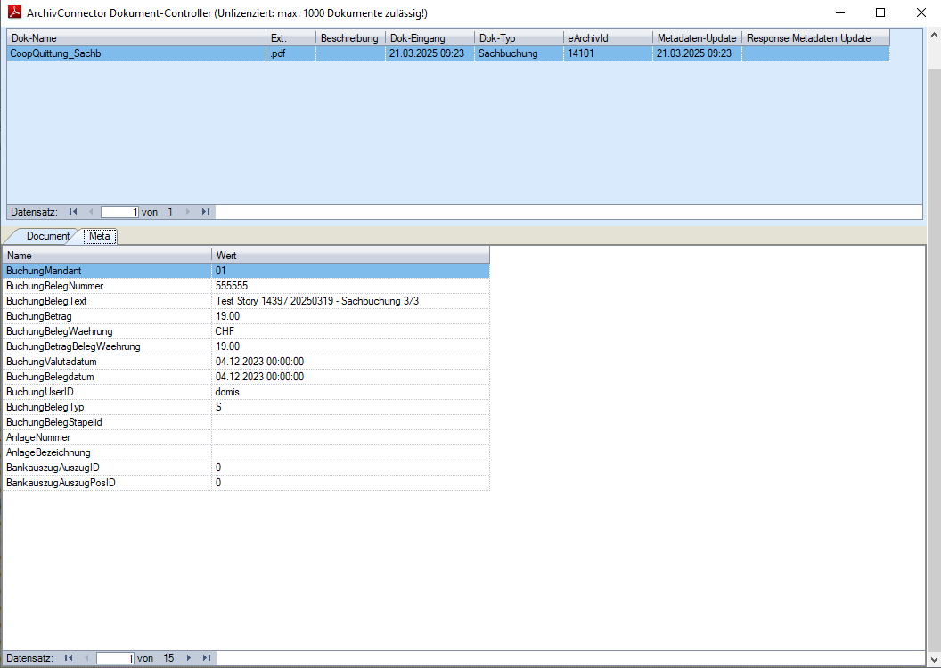ArchivConnector Dokument Controller (F2) | Wenn ein Dokument im angebundenen elektronischen Archiv steht, kann das Dokument aus dem eArchiv direkt über die Funktion [ArchivConnector Dokument Controller (F2)] aus der Applikation NEXUS/FINANZ aufgerufen werden. Das archivierte Dokument inklusive deren Metadaten (z.B. die zugehörige eArchiv-ID) werden beim Aufrufen der Funktion [ArchivConnector Dokument Controller (F2)] im Fenster "ArchivConnector Dokument-Controller" angezeigt. Beispiel: Hinweis: Dies ist eine lizenzpflichtige Funktion. Mehr Informationen zur Funktion eArchivConnector sind im Kapitel Finanz Allgemein/ArchivConnector Dokument Controller zu finden. |