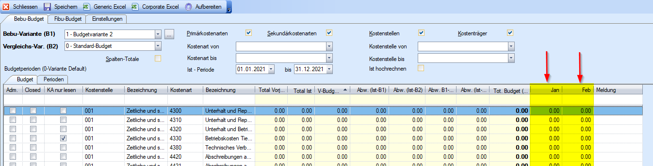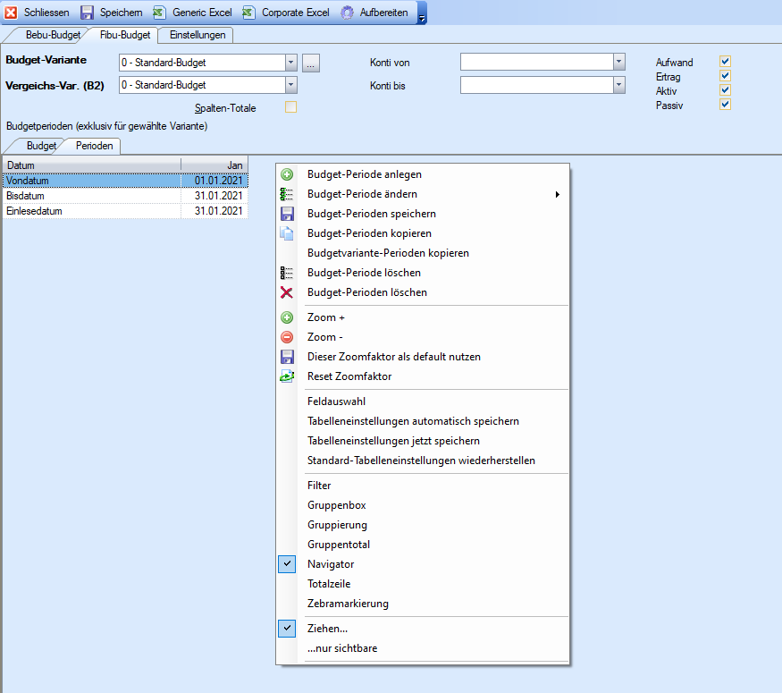 Die Budgetierungsmaske schliessen und erneut öffnen: Nun erscheinen in den Budgetgrids die neuen Perioden.