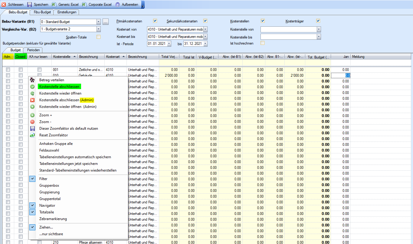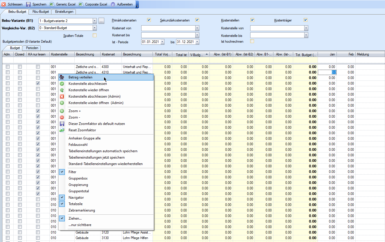 Die Budget-Zahlen können direkt im Programm in den angelegten Perioden-Spalten oder via Excel bearbeitet werden.