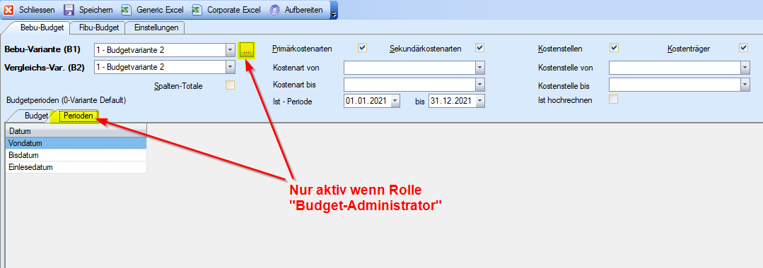 - Muss im Tab 'Budget-Perioden' die Anzeige aktiviert sein. Der User muss zum Bearbeiten der Einstellung dazu Rolleninhaber 'Budget-Administrator' sein. Siehe 'Einstellungen' im Abschnitt Das Budgetierungsfenster,