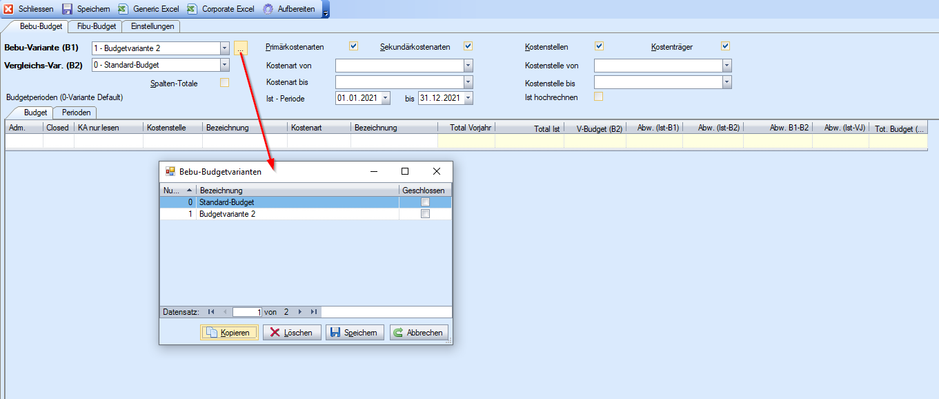 - Auf der Budgetvariante selbst: Siehe Bearbeiten/Erfassen einer Budget-Variante