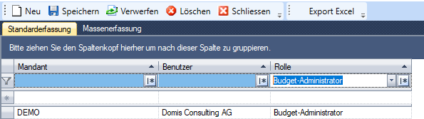 Legen Sie einen Budgetadministrator fest indem Sie einem gewünschten Benutzer und Mandanten die Rolle Budgetadministrator zuweisen. Benutzen Sie dazu die Beschreibung aus Kapitel Administration Allgemein → User-Rollen-Verwaltung.
