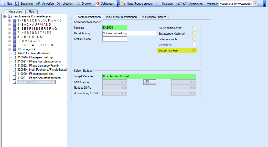Das Verwalten und Anzeigen erfolgt immer für eine ganze Kostenstelle: