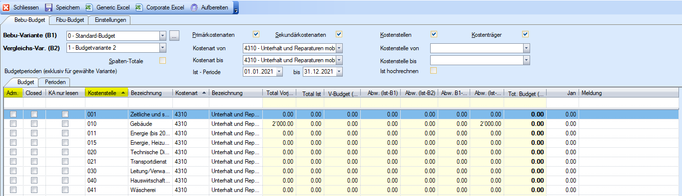 - Es gibt die Stufen 'Kostenstelle' und 'Adm', was in den Spalten ersichtlich ist.