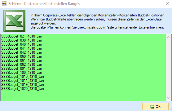Bei fehlenden Einträgen im Excel gegenüber der Selektion im Budget-Grid erscheint:
