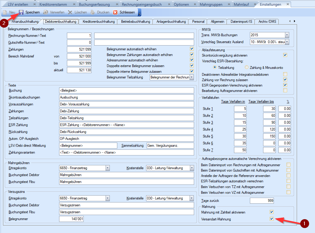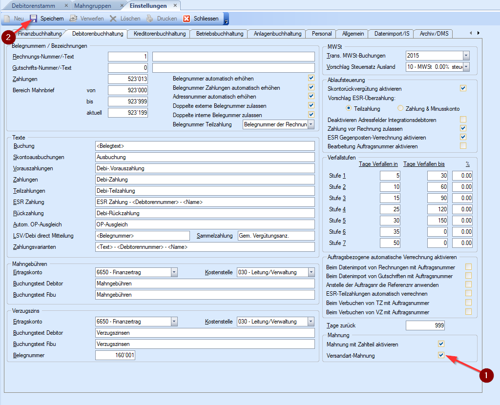 Einstellungen/Debitorenbuchhaltung: Aktivierung Versandart-Mahnung
