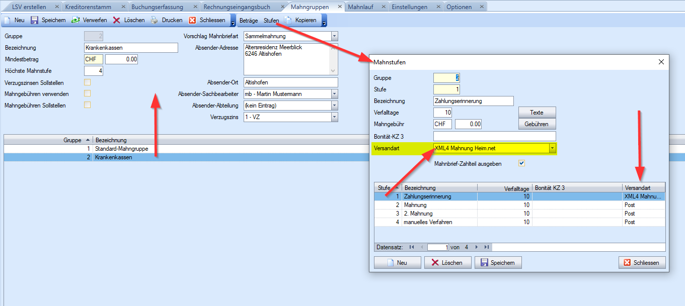 Variante 1: Aktivierung der Versandart «XLM4 Mahnung» über Mahngruppen auf Mahnstufenebene: