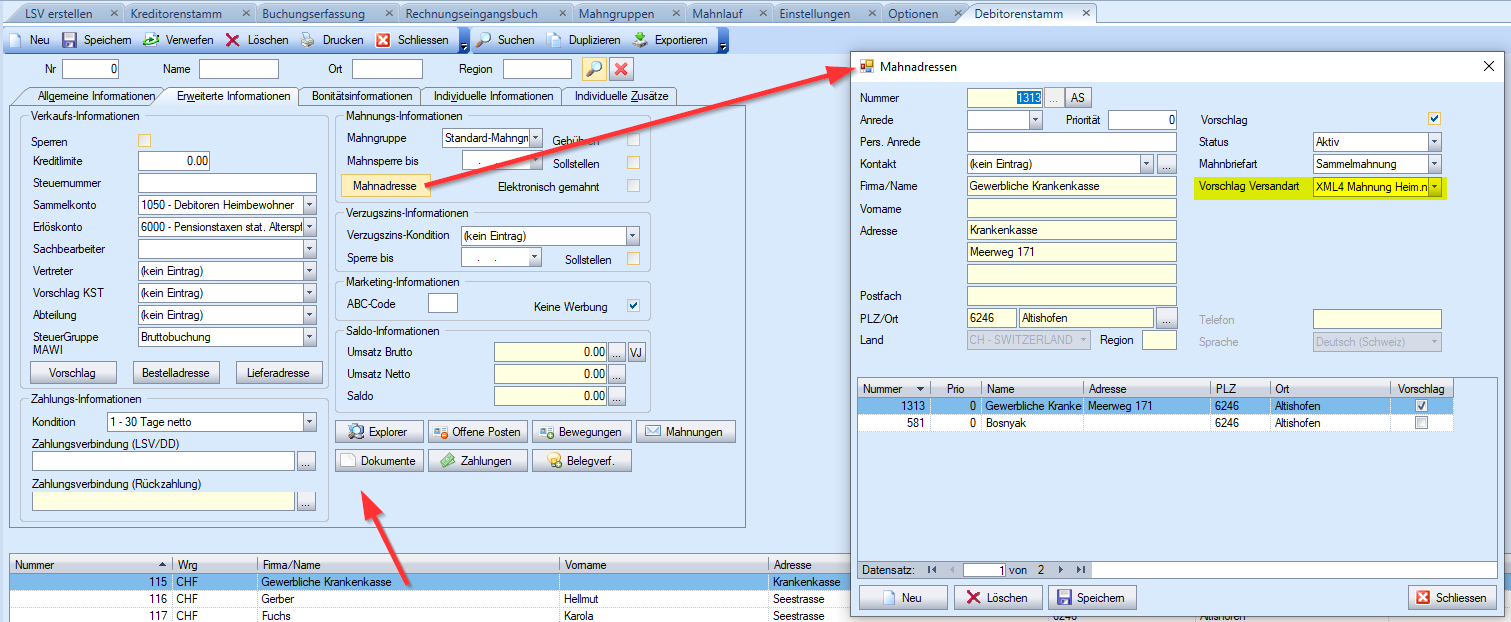 Variante 2: Aktivierung der Versandart «XLM4 Mahnung» über die Mahnadresse auf Debitorenebene: