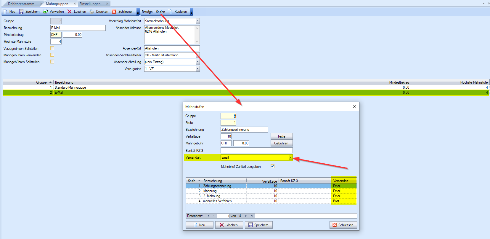 Aktivierung der Versandart «Email» über Mahngruppen auf Mahnstufenebene: