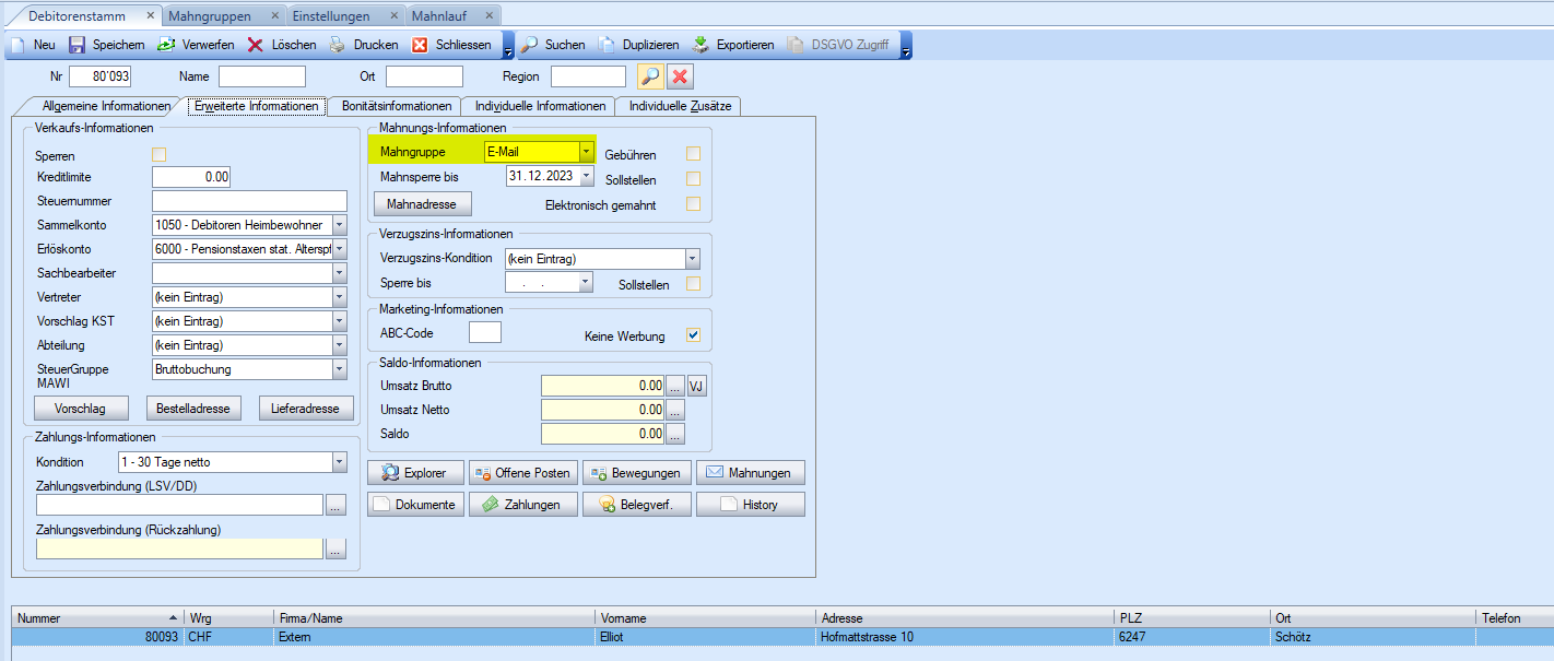 Bei den Debitoren, welche Mahnungen per E-Mail erhalten sollen Mahngruppe zuweisen: