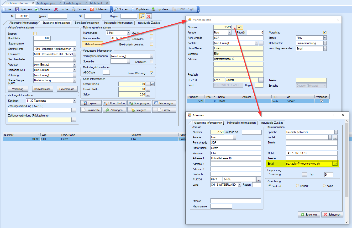 Des weiteren muss sichergestellt werden, dass beim entsprechenden Debitor bei der entsprechenden Mahnadresse eine E-Mail Adresse hinterlegt ist.