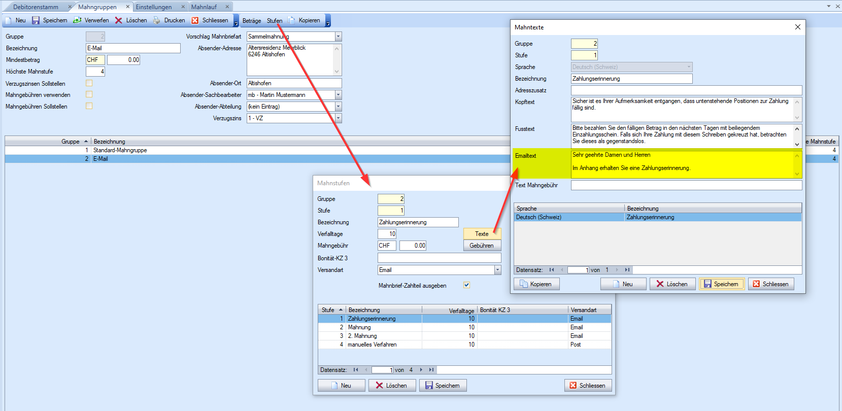 Ausserdem können über die Mahnstufen auch der Emailtext definiert werden:
