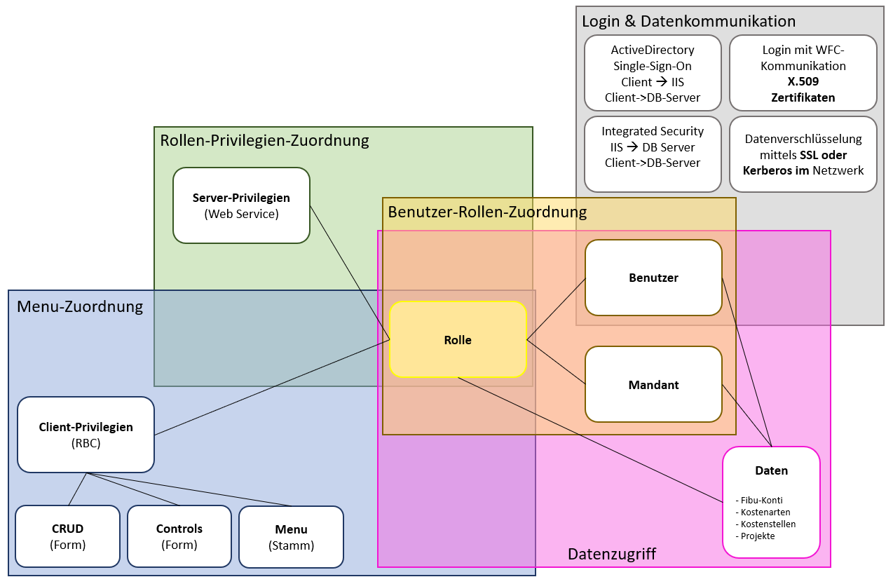 Ein Benutzer identifiziert sich über das Login. Die Zugriffsrechte eines Benutzers definiert sich über die ihm zugeordneten Rollen, Mandanten und die Datenzugriffsrechte. Die Privilegien einer Rolle werden als Serverprivilegien (Webservices) und Client-Privilegien vergeben.