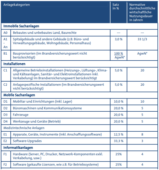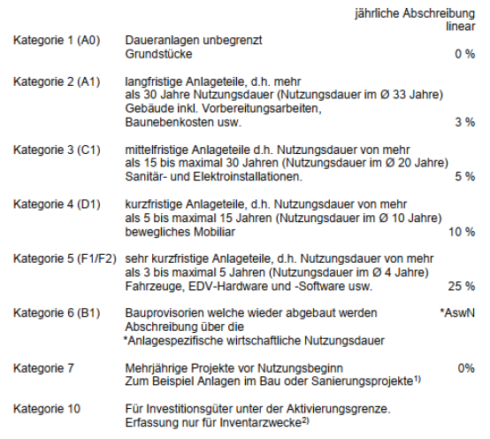 - In der Regel werden in dieser Tabelle die Einträge gem. Nutzungsdauer der Kategorien gem. Handbuch Curaviva angeglichen (B = bilanzielle Abschr. / K = kalk. Abschr.)