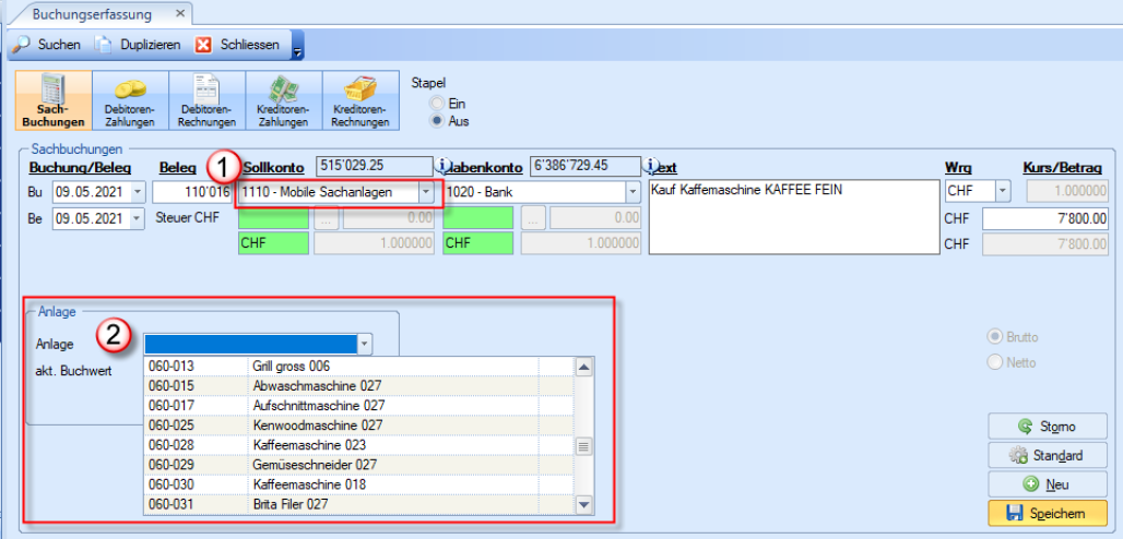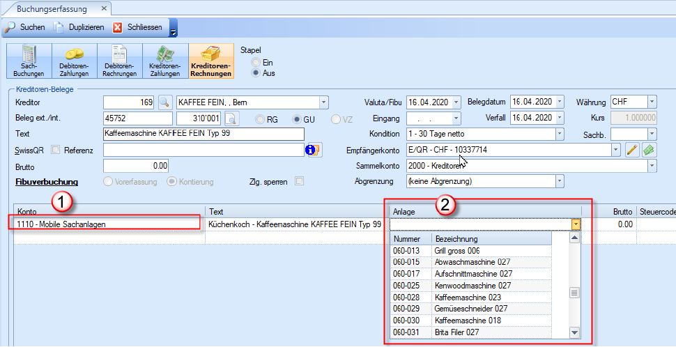 - Sobald ein AV-Konto (1) bei der Kontierung gewählt wird, erscheint das Feld (2) zur Auswahl der Anlage