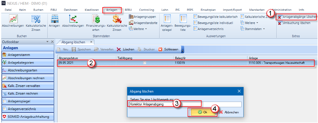 - Bereits erstellte Anlagenabgänge können bei Bedarf gelöscht werden