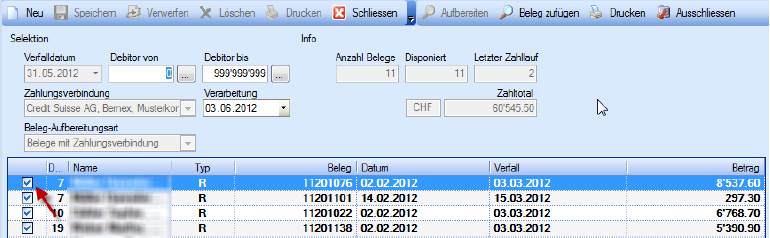 - Nach der Suche der offenen Posten werden diese in der Belegauswahl angezeigt