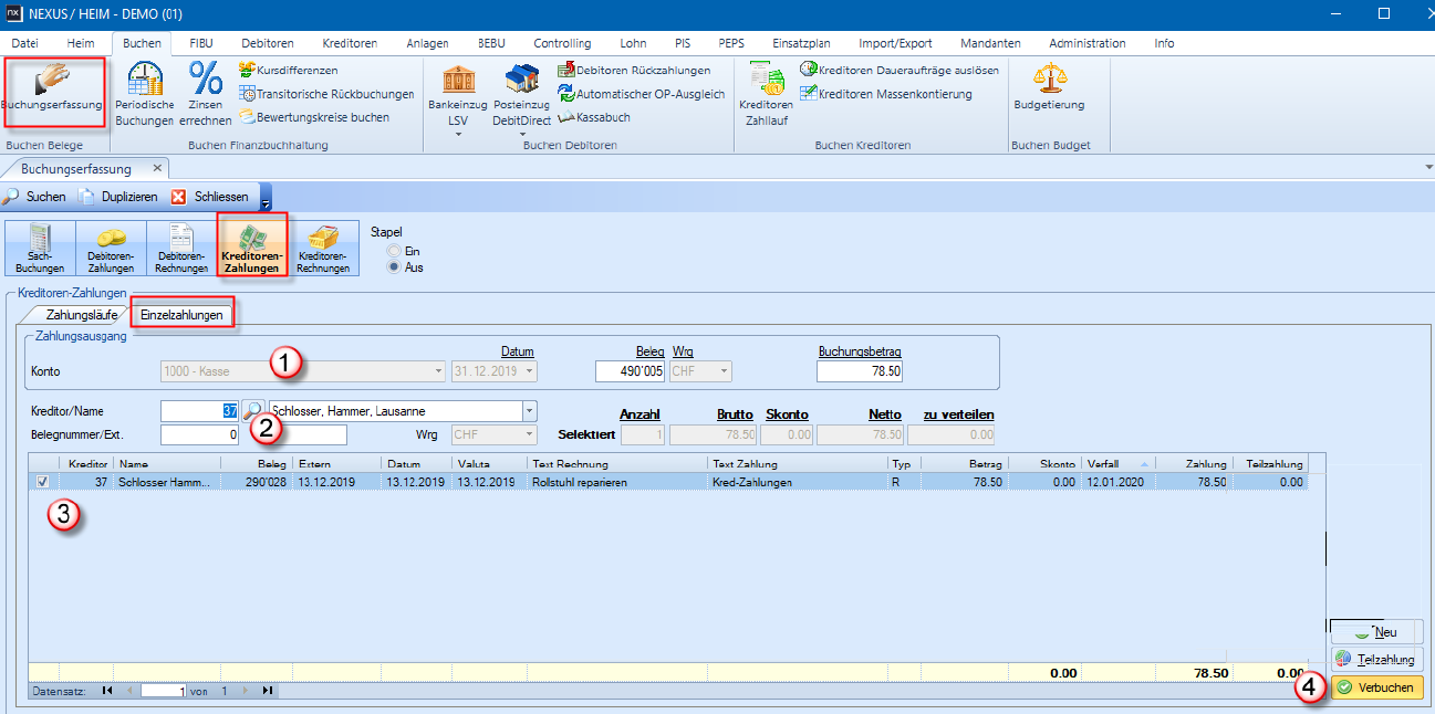 befindet sich in der Buchungserfassung, Funktion Kreditoren Zahlungen, Register Einzelzahlungen - So können z. B. Barzahlungen an Lieferanten über die Kasse verarbeitet werden oder LSV-Kreditoren