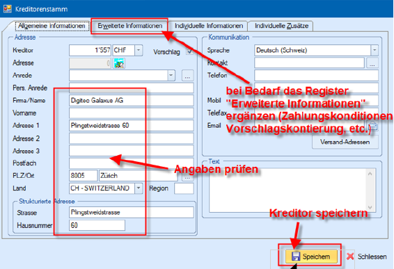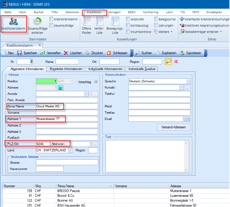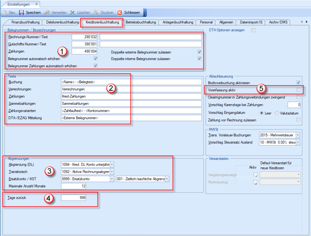 - Menupunkt Administration / System / Extras / Einstellungen / Register Kreditorenbuchhaltung