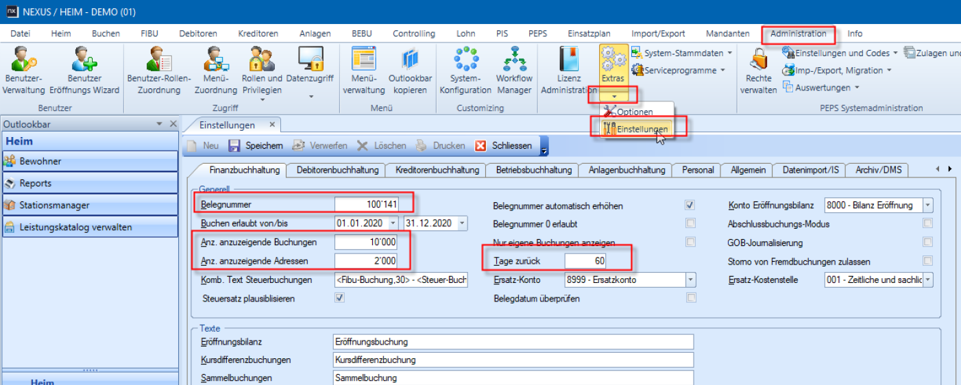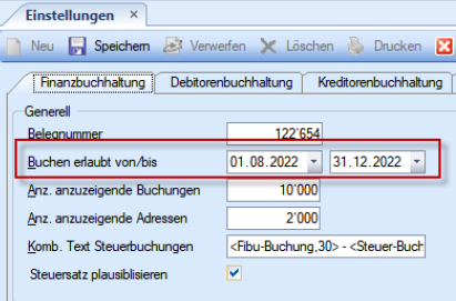- Menupunkt Administration / System / Extras / Einstellungen / Register Finanzbuchhaltung