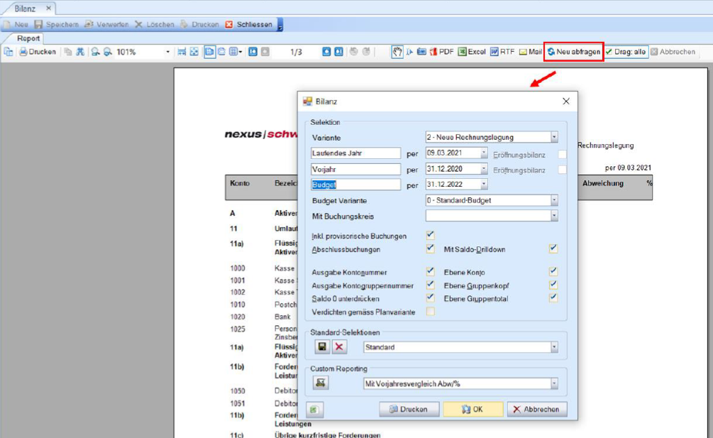 Soll nach Anpassung von Eingaben oder Daten (etwa für alternative Perioden, andere Darstellungsweisen der Daten oder nach zwischenzeitlich in einer anderen Sitzung vorgenommenen Buchungen) die Auswertung aktualisiert erneut dargestellt werden kann über die Funktion ‚Neu abfragen‘ die Auswahlmaske erneut aufgerufen werden.