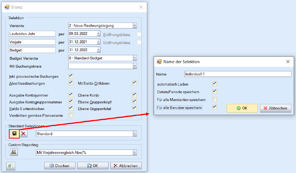 In den Auswertungen lassen sich häufig genutzte Selektionen speichern um direkt bei Listanwahl zur Verfügung zu stehen. Mittels des Disketten-Symbols wird der Inhalt der Auswahlmaske (etwa ein spezieller Report und/oder eine gewünschte Periode) unter einem speziellen Namen, auch für alle Mandanten und Benutzer, gespeichert.