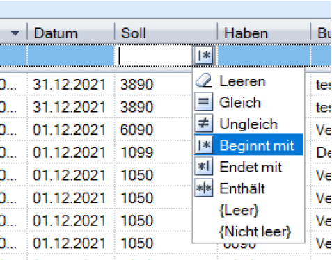 | Soll | z.B. 4* | Alle Belege mit Sollkonto beginnend mit 4 |