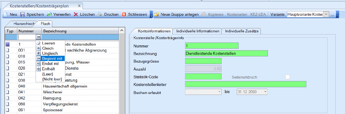 In den Stammdatenprogrammen gibt es ein Register „Flach“, in dem die Stammdatensätze einfach in „flacher“ Struktur aufgelistet sind. Über die Filterzeile kann hier nach der Nummer oder Bezeichnung gesucht werden.