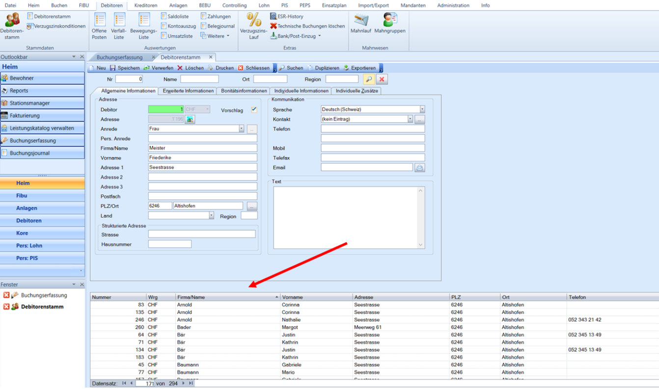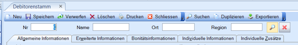 Die Applikation verfügt im Bereich Stammdaten Debitoren/Kreditoren über eine Filterzeile, in der über Nummer, Name, Ort oder Region sehr schnell der gewünschte Stammsatz gefiltert werden kann.