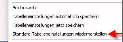 Bei Wahl der Funktion „Standard-Tabelleneinstellungen wiederherstellen“ wird das Grid auf den Standard (angezeigte Spalten und Reihenfolge) zurückgesetzt.