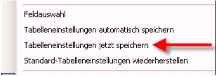 Über die Funktion „Tabelleneinstellungen jetzt speichern“ werden die oben gemachten Anpassungen für die nächsten Programmzugriffe gespeichert.