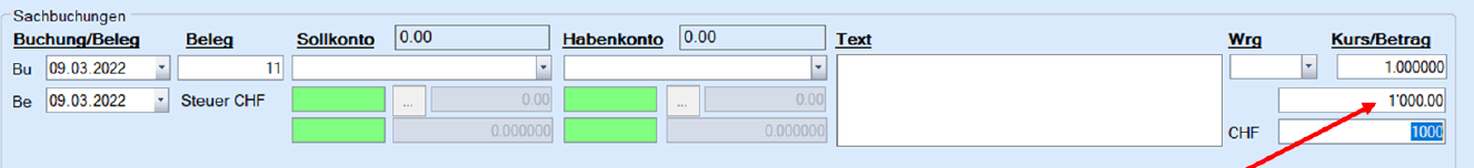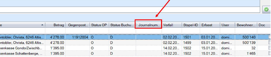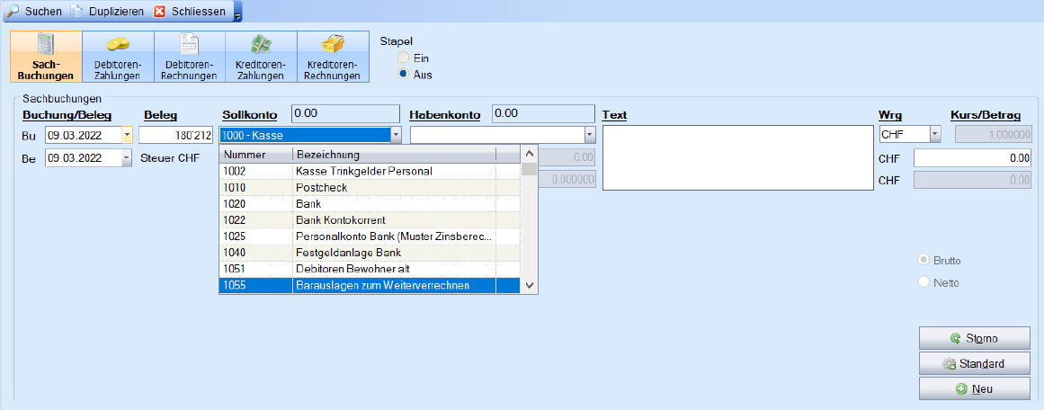 In den Buchungsmasken kann im unteren Grid ebenfalls nach den einzelnen Kriterien gesucht werden, z.B. nach Belegnummer, Datum oder Betrag.