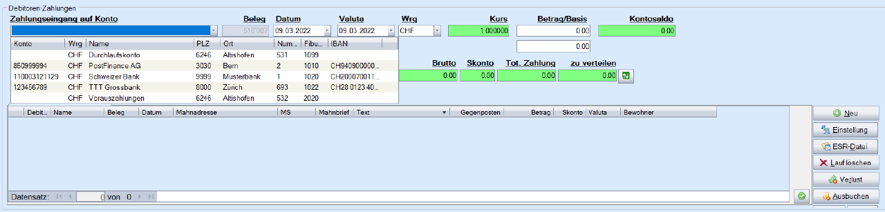 | Debitoren | Stammdaten und Auswertungen der Debitorenbuchhaltung, Extras wie Verzugszins oder Bank/Post-Ermächtigungen und das Mahnwesen |