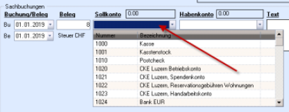 Die Auswahl kann durch Einblenden der jeweiligen Stammdatenliste (Alt + Pfeil nach unten) und nachfolgendem Anklicken mit der Maus ausgewählt werden. Alternativ reicht die Eingabe der ersten oder weiterer bekannter Schlüsselstellen, der entsprechende erste Treffer wird eingestellt.