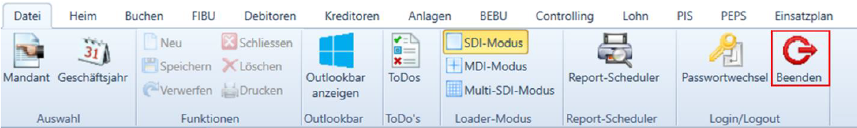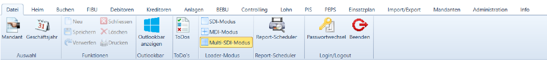 | Datei | Mandanten wählen, Geschäftsjahr wählen, Benutzereinstellungen, Neu anmelden, Passwortwechsel, Beenden |