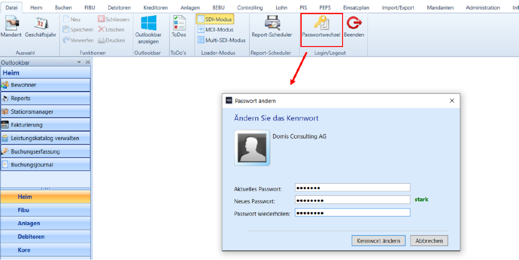 Besteht benutzerseitig der Wunsch das Passwort zu ändern, kann diese durch Auswahl des Menüpunktes „Datei | Passwortwechsel“ erfolgen: