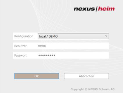 Das Drop-Down-Menü „Konfiguration“ beinhaltet die zur Verfügung stehenden Datenbanken. Nach Eingabe der Login Daten „Benutzer“ und „Passwort“ kann die Anmeldung im System mit Hilfe der Schaltfläche [OK] erfolgen.