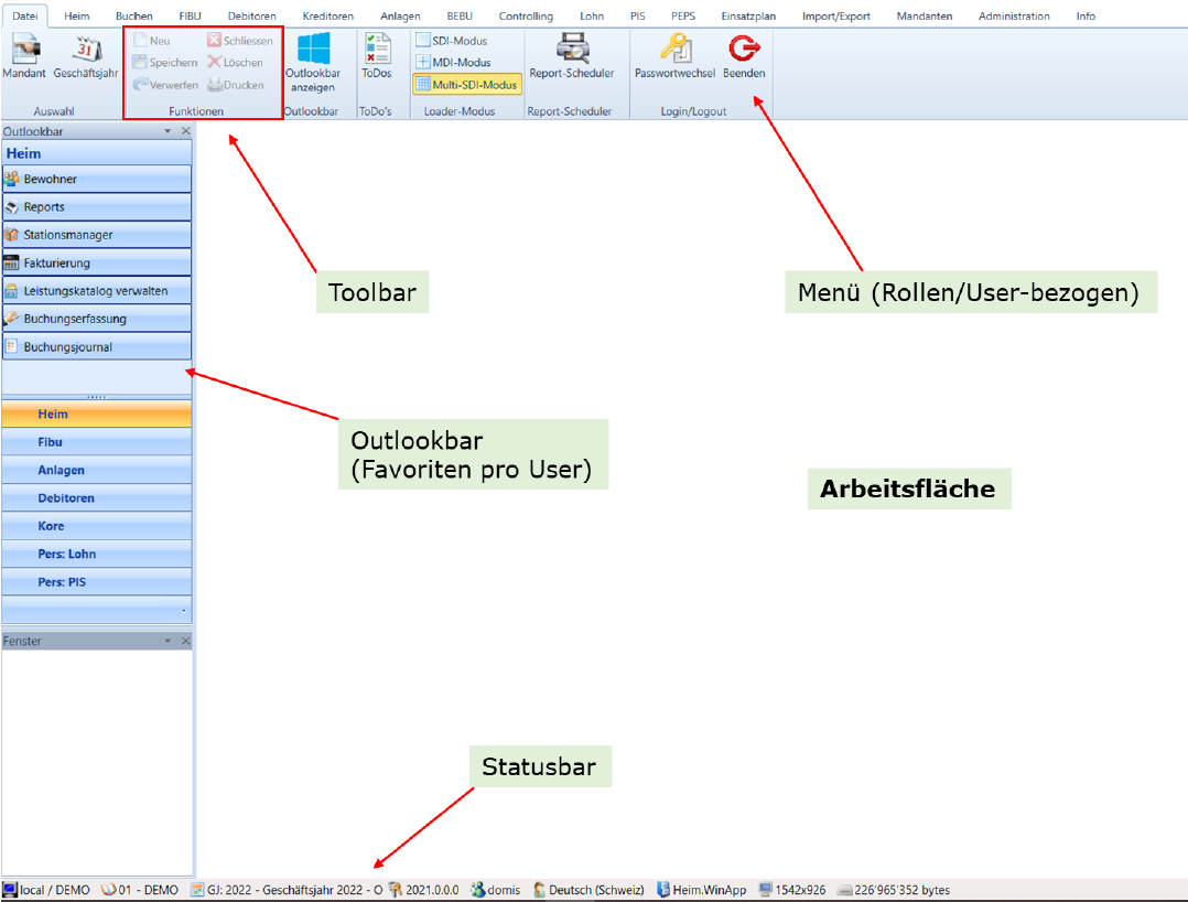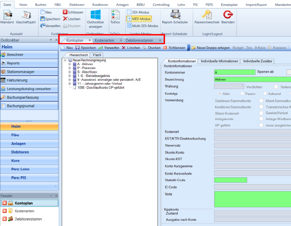 Der MDI- Modus zeichnet sich dadurch aus, dass gleichzeitig mehrere Bearbeitungsfenster geöffnet werden können. Über die Fensterliste links unten in der Outlookbar oder den Fensterlaschen kann zwischen den Anwendungen hin und her gewechselt werden. Der Nachteil dieses Modus ist, je mehr Programme geöffnet sind, desto unübersichtlich wird die Arbeitsoberfläche für den Benutzer.
