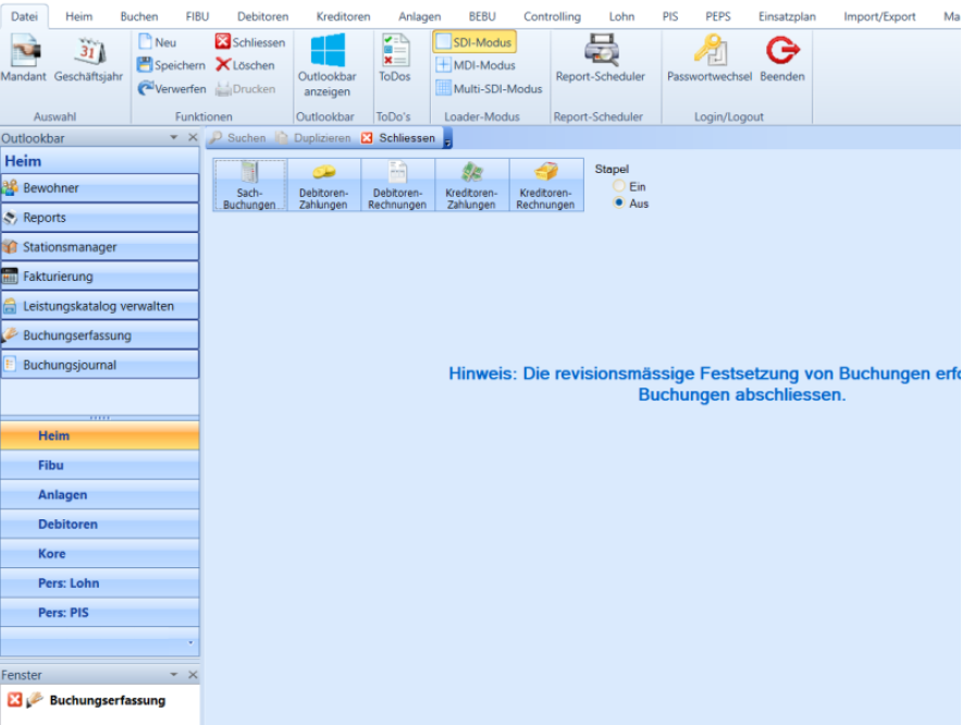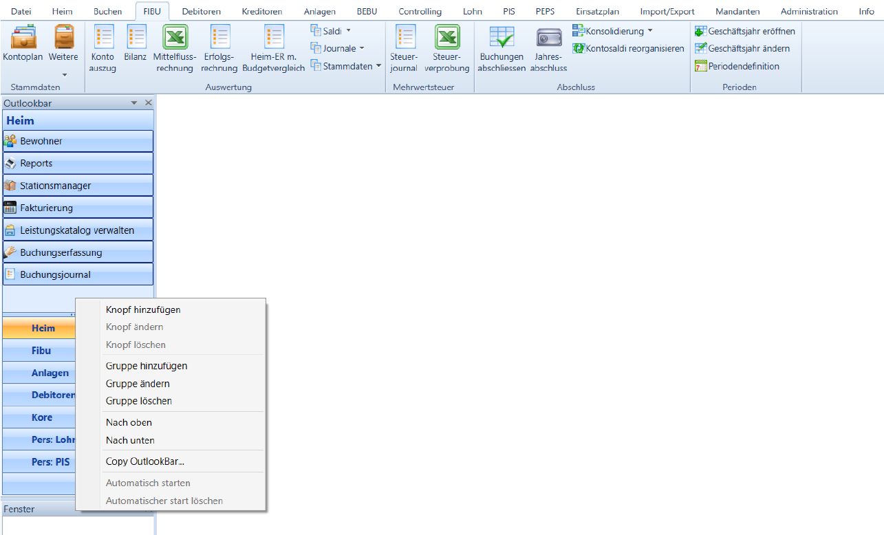 | FIBU | Stammdaten und Auswertungen der Finanzbuchhaltung sowie Mehr-wertsteuer-, Abschlussprogramme und die Periodendefinitionen |