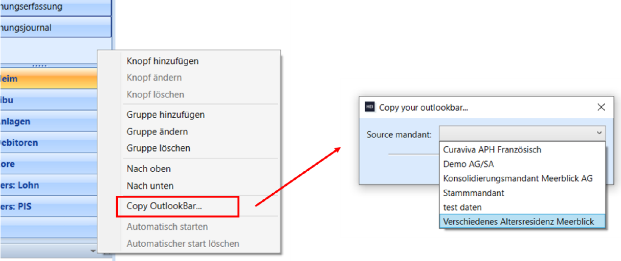 - Die Outlookbar kann von einem Mandanten auf einen anderen kopiert werden. Über ‚Copy Outlookbar‘ kann die eigene Outlookbar aus einem Quell-Mandanten in den aktuellen Mandanten kopiert werden: