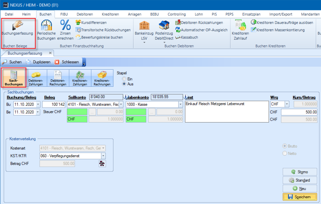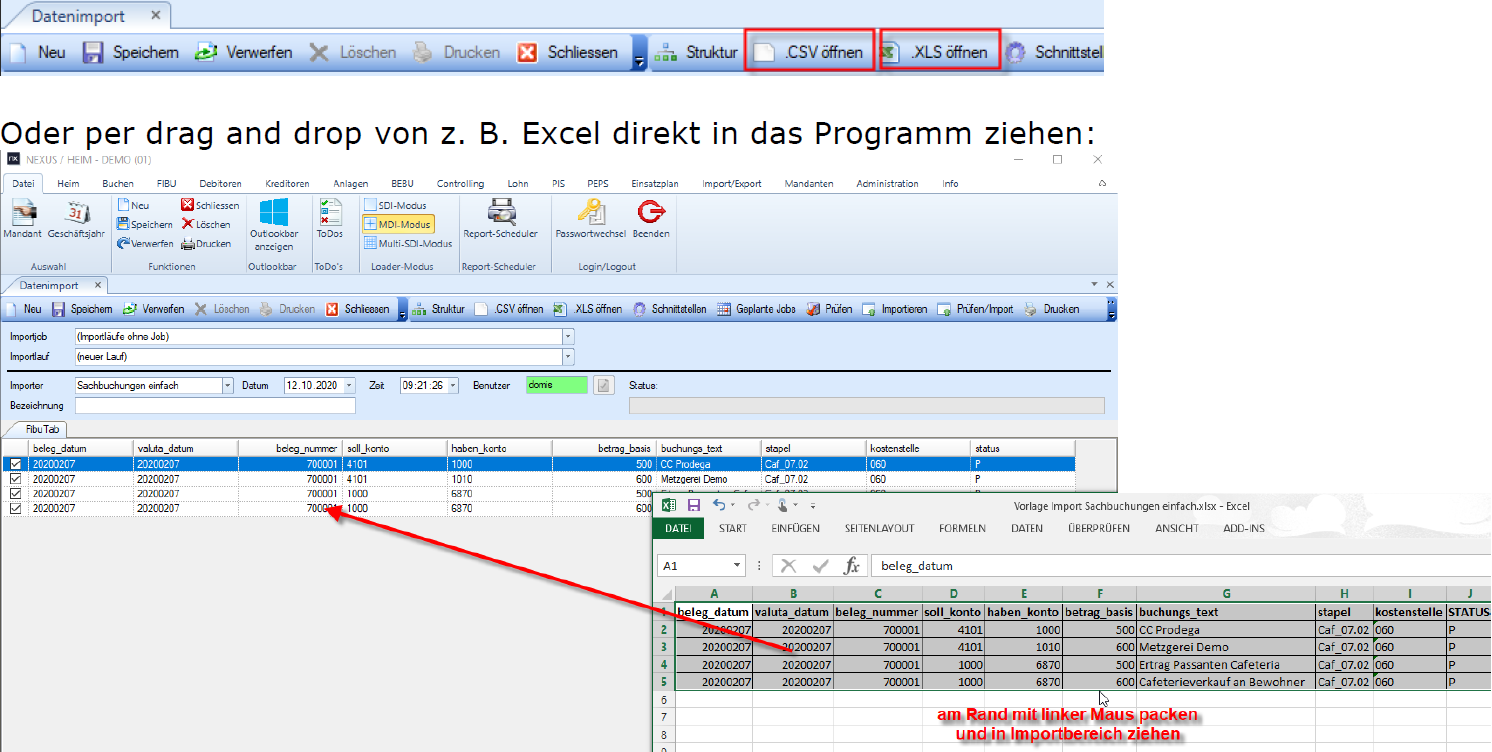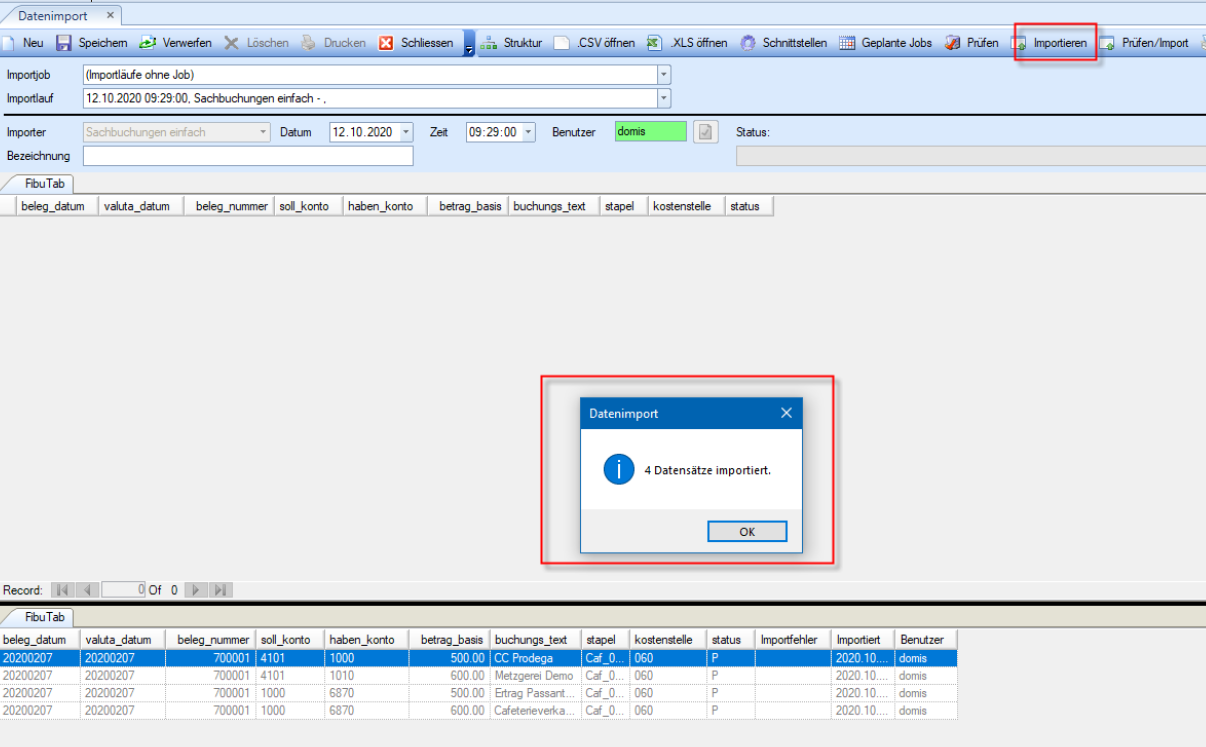 Mittels Button „Importieren“ werden die Buchungen als Sachbuchungen im Hauptbuch gespeichert:
