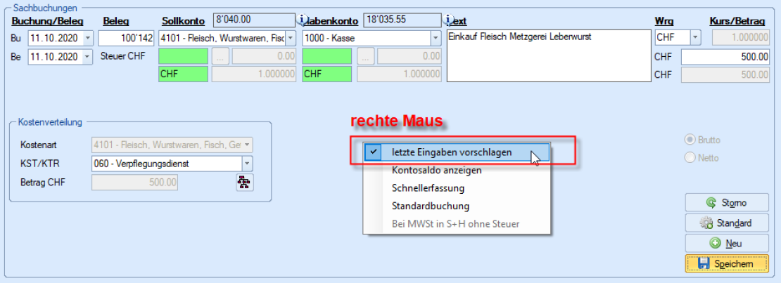 Mittels rechter Maustaste kann definiert werden, ob nach der Speicherung die letzte Buchung als Vorschlag stehen bleiben soll oder ob eine leere Buchungsmaske angezeigt werden soll.