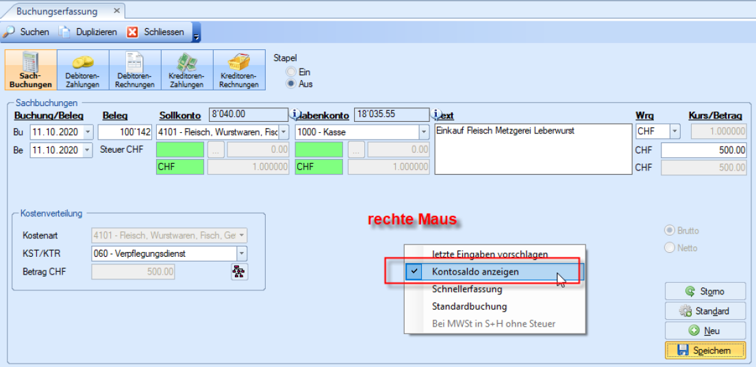 Mittels rechter Maustaste kann eingestellt werden, ob in der Buchungsmaske die Kontensalden angezeigt werden oder nicht.