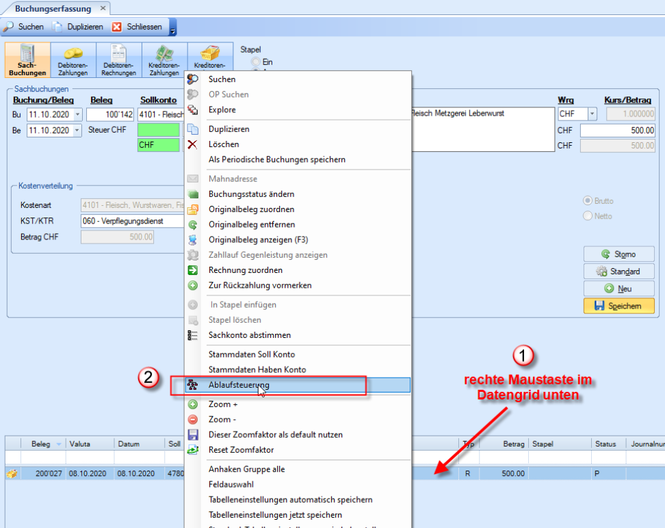 Im Buchungsgrid unten kann via rechter Maustaste der Punkt „Ablaufsteuerung“ gewählt werden.
